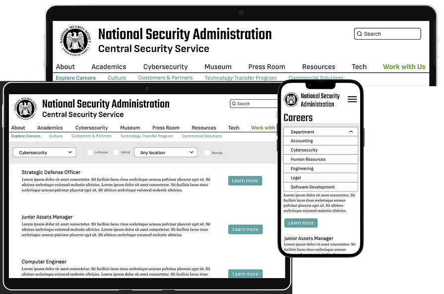 As the mid-fi prototype developed, a round of user testing was conducted. This time the tasks were geared more accurately towards users like Craig and how they’d interact with the navigation system: find the NSA’s mission statement, locate job openings in cybersecurity, and find student opportunities.